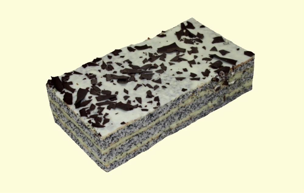 Ciasto biszkoptowe z makiem przekładane kremem budyniowym w polewie z białej czekolady.