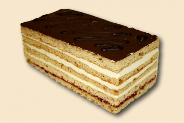Ciasto biszkoptowo-tłuszczowe z miodem sztucznym przełożone kremem o smaku waniliowym i czerwoną porzeczką w żelu.