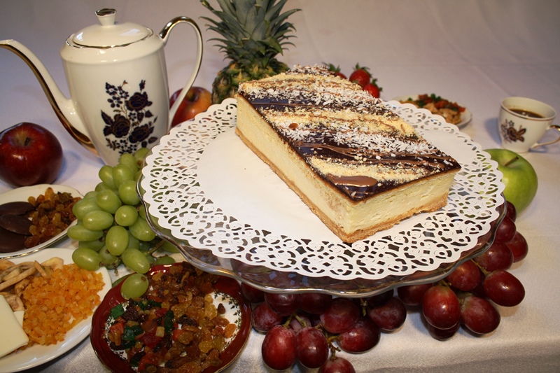 Sernik na cienkim i chrupiącym spodzie polany ciemną czekoladą.