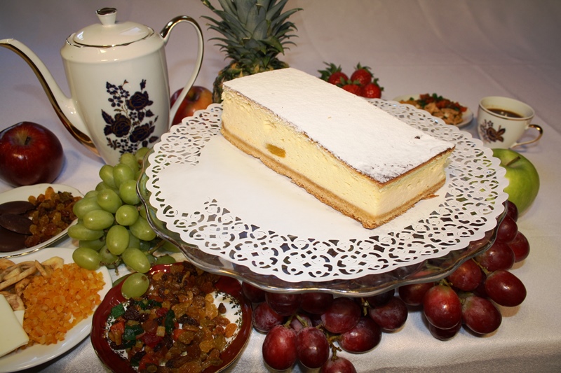 Sernik z kawałkami brzoskwini na cienkim i chrupiącym spodzie.