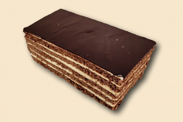 Kakaowe ciasto biszkoptowe przełożone kremem o smaku waniliowym.