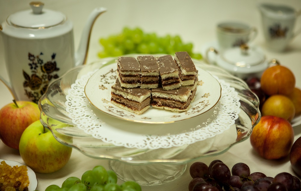 Ciastka biszkoptowo-tłuszczowe przekładane marmoladą wieloowocową.